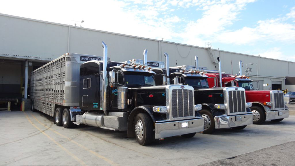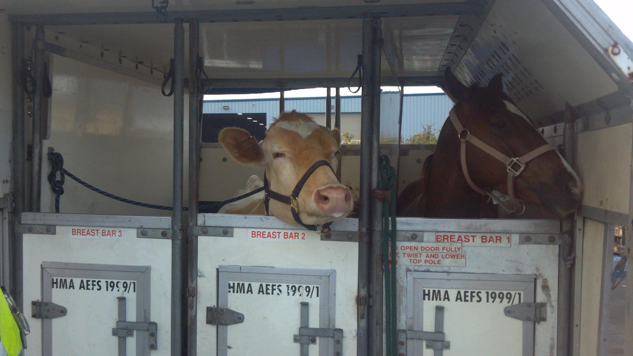 Cow and Horse in trailer.Cargo box being loaded on a plane.Cargo ship on the ocean.